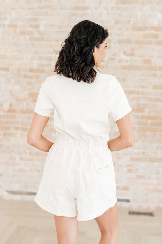 Elevate your wardrobe with our Break Point Collared Romper in Natural! Crafted from high stretch denim for comfort and durability, this romper features a collared neckline and front snap closures for a stylish touch. Front and back patch pockets and a smocked elastic waistband provide convenience and a flattering fit. Perfect for the warmer weather!