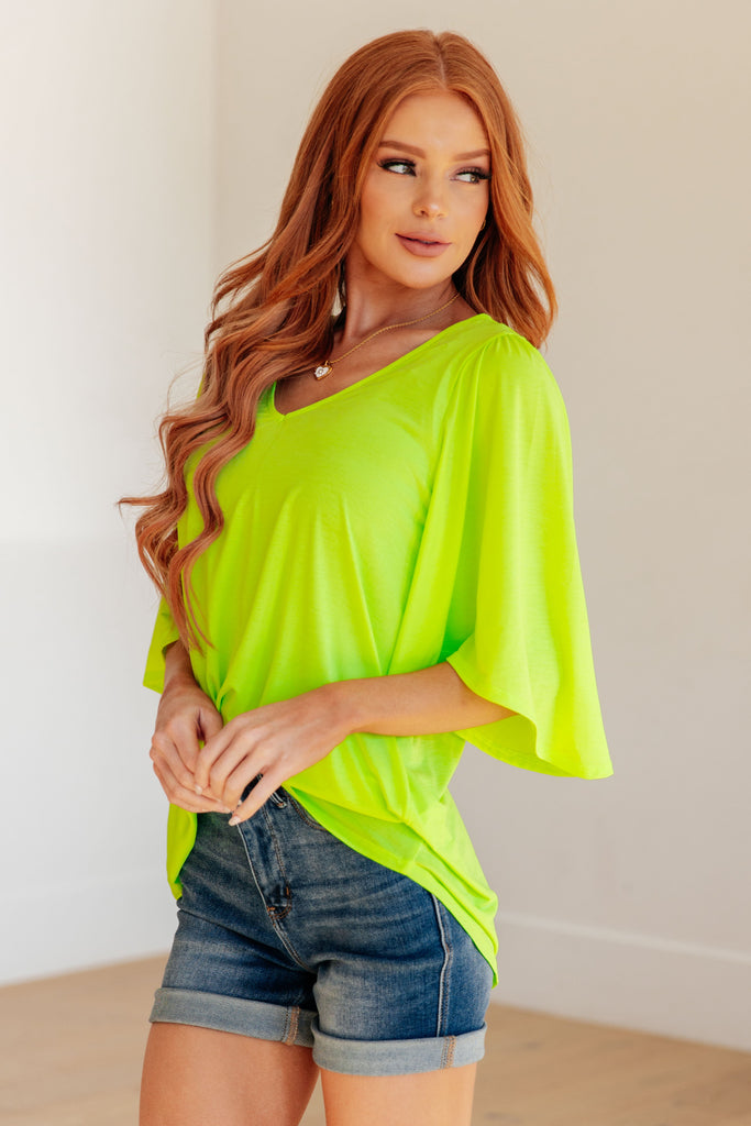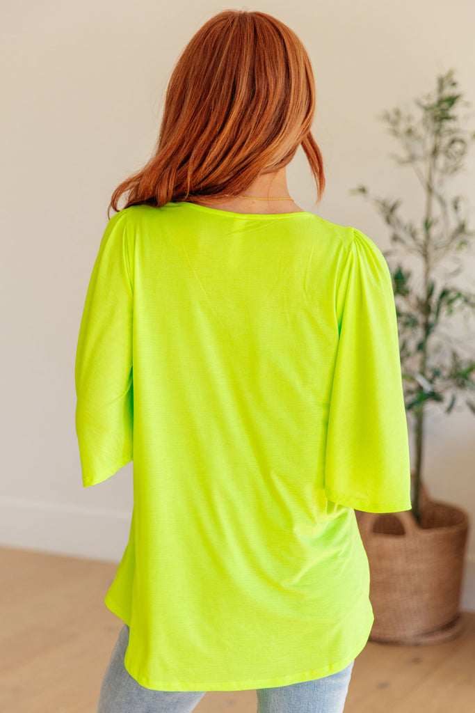 Unleash your inner fashionista with the Cali Blouse in Neon Green. This chic top boasts Bulgari fabric that keeps you cool and wrinkle-free, while being lightweight and stretchy for all-day comfort. The gathered flare sleeves and v-neck add a touch of stylish flair. Rock a comfort fit without sacrificing style.